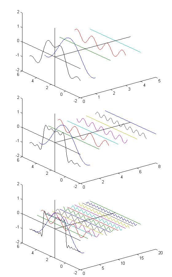 在這幾幅圖中,最前面黑色的線就是所有正弦波疊加而成的總和,也就是越來越接近矩形波的那個圖形。而後面依不同顏色排列而成的正弦波就是組合為矩形波的各個份量。這些正弦波按照頻率從低到高從前向後排列開來,而每一個波的振幅都是不同的。一定有細心的讀者發現了,每兩個正弦波之間都還有一條直線,那並不是分割線,而是振幅為0的正弦波!也就是說,為了組成特殊的曲線,有些正弦波成分是不需要的。